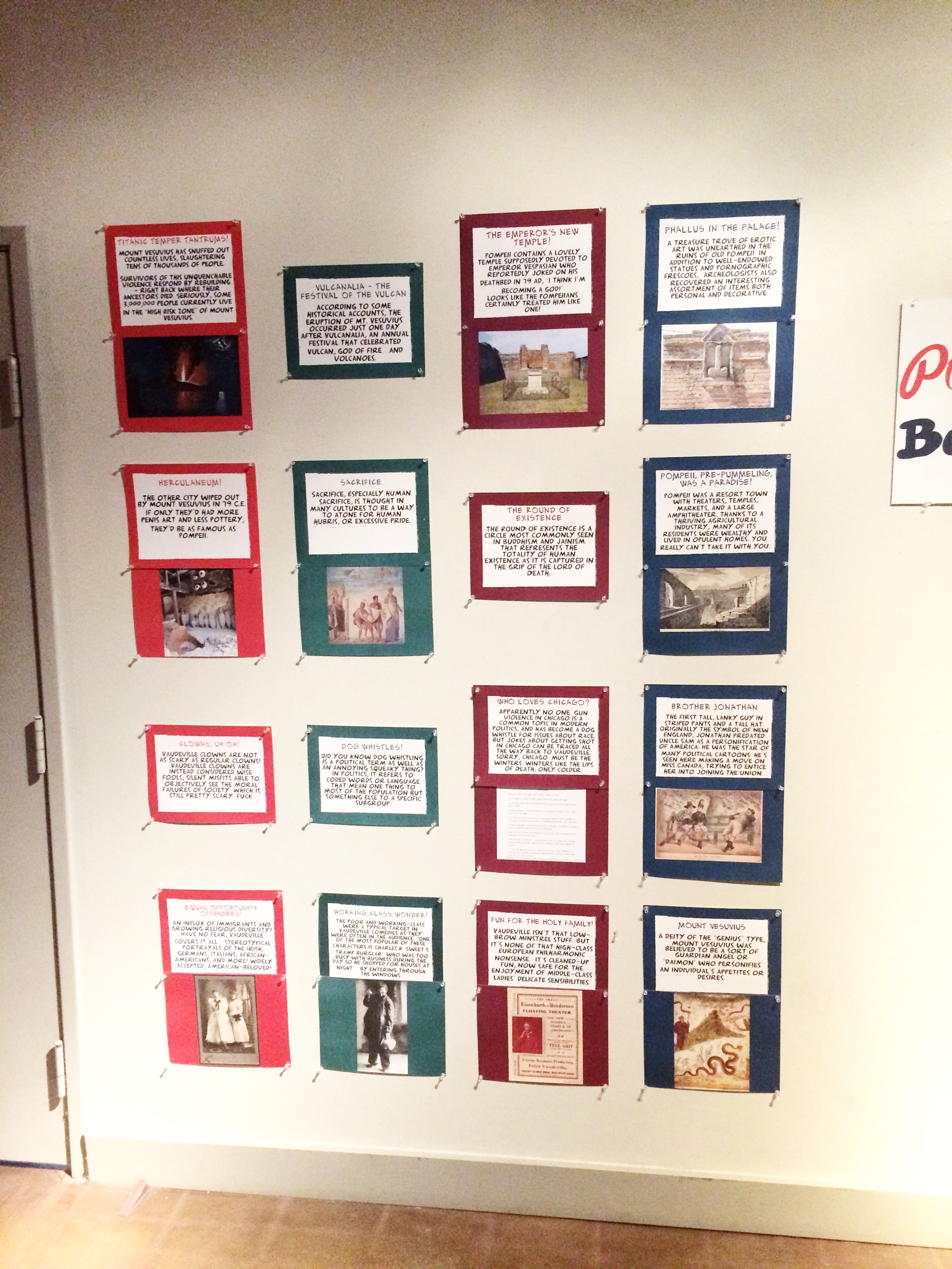 We pulled facts from Vaudeville history and Pompeii history, and put our own POMPEII!! stylistic spin on them, incorporating the tone of the show itself. We also wanted to keep our lobby as interactive as possible, so we created a photo challenge area, and a maze for audience members for audience members to try to escape.